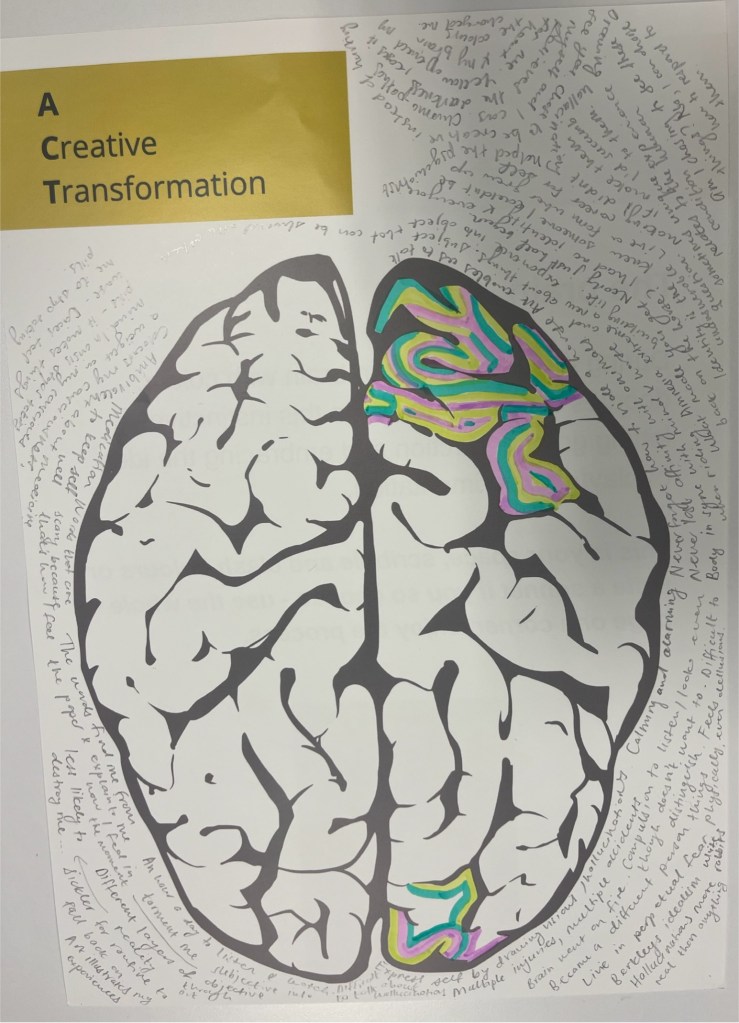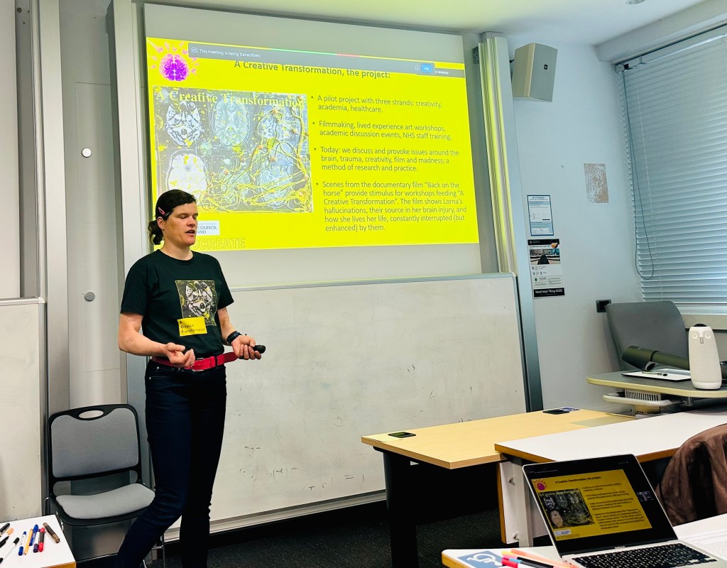 Roxana introduces the seminar and we begin. I’m not sure if I say too much or the right thing, but I am connected with the participants in the room. Lots of nods. I hear people scribbling on the brain handouts. The discussion and questions are rich and helpful. Matthew makes some insightful comments and asks me about the different layers of reality I perceive, which are splashing about the room, in waves, as he speaks, and about my sense of identity after total amnesia. I try to see through the waves. Answering his questions helps me think further about what I’m trying to do with the ACT project. Roxana asks me about resilience and we develop the discussion that she and I are proposing in the paper that we are writing together. And then there are questions from people online and people in the room.