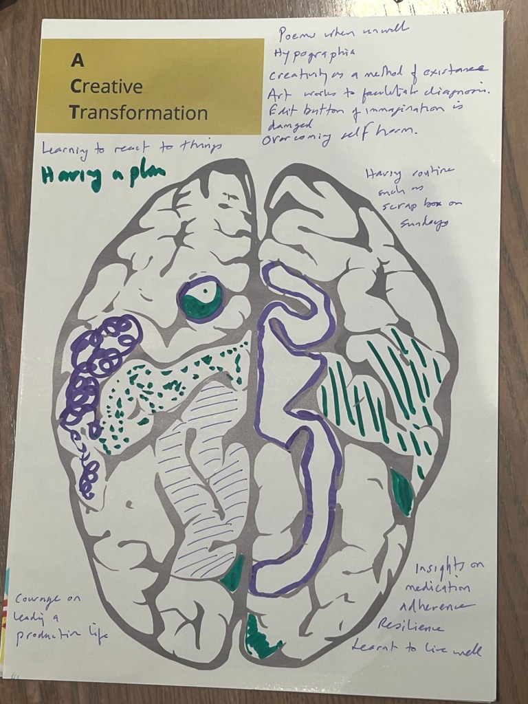 About 10 or 12 attendees turn up in real life and at least 30 or 40 people are joining us online. I am really pleased with this number. The room is bustling; people seem really interested, engaged and excited when I give them the handout of the ‘Creative Brain’ for them to scribble on with coloured pencils and pens. It is good that we have the technology to facilitate people joining us online as well.