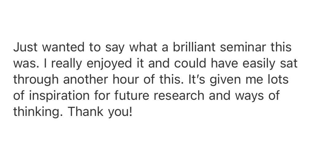 We walk to the School of Psychology, where the event is taking place. Everything is perfect. The room in which we are holding the seminar has very fancy technology which means that the hybrid component of the seminar will work efficiently and well. There is a camera with a 360° lens that follows whoever is speaking. Tracey is involved with the administration; she sets up all the technology effortlessly and with expertise. We are ready.