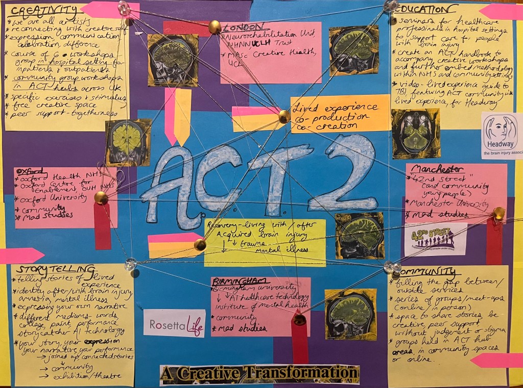‘A Creative Transformation’, ACT 2, has taken the project around the UK, working with different mediums—visual arts, creative writing, film, AI technology—always working with people who have lived experience of acquired brain injury or a neurological condition. It has been fulfilling to develop the ACT remit and expand our community.