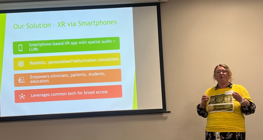 After lunch, Russell Beale and Renata Reniers presented their smart phone app technology which uses AI to simulate hallucinations. The purpose of this is to educate healthcare professionals so they can have more empathy with their patients. Renate gave some background of the technology they are using on a smart phone app to put sounds and voices in different areas of space to simulate hallucinations. They want to upscale this device and use it in large spaces to educate medical students and healthcare professionals. They hope that the sound device will copy and express and evoke and simulate what it is like to have a hallucination.
