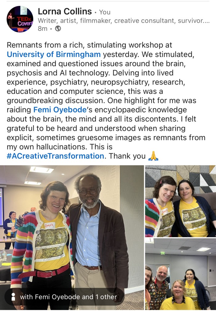 This was an experimental workshop examining psychosis, the brain and AI technology, held at the Edgbaston Hotel, part of Birmingham University. Lorna spoke about her lived experience of psychosis after brain injury. The renown psychiatrist, Femi Oyebode (a living encyclopaedia) spoke about medicine, psychiatry, hallucinations and AI technology. He gave the example of someone with phantom limb syndrome, when they’ve had a limb amputated and they have a hallucination because they feel as though they still have their limb, they have a lot of pain in something that is not there. Femi described an experiment to relieve or correct the pain of a phantom limb, using basic manual technology. So interesting. After Femi, Ruta Kontautaite spoke. She is a neuropsychiatrist, and she gave an overview of neuropsychiatry and AI technology, in relation to her own fascinating work. This was a very useful grounding to the topic. Finally, in the morning, Roxana Baiasu gave her talk, which included a philosophical perspective surrounding AI technology, the brain, mental illness and psychosis.