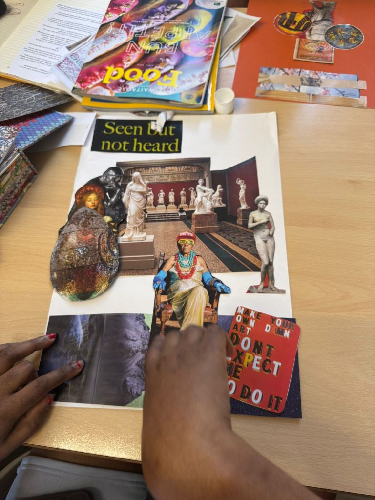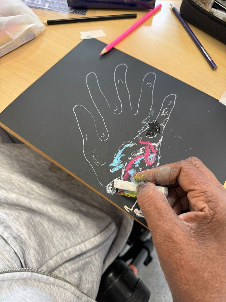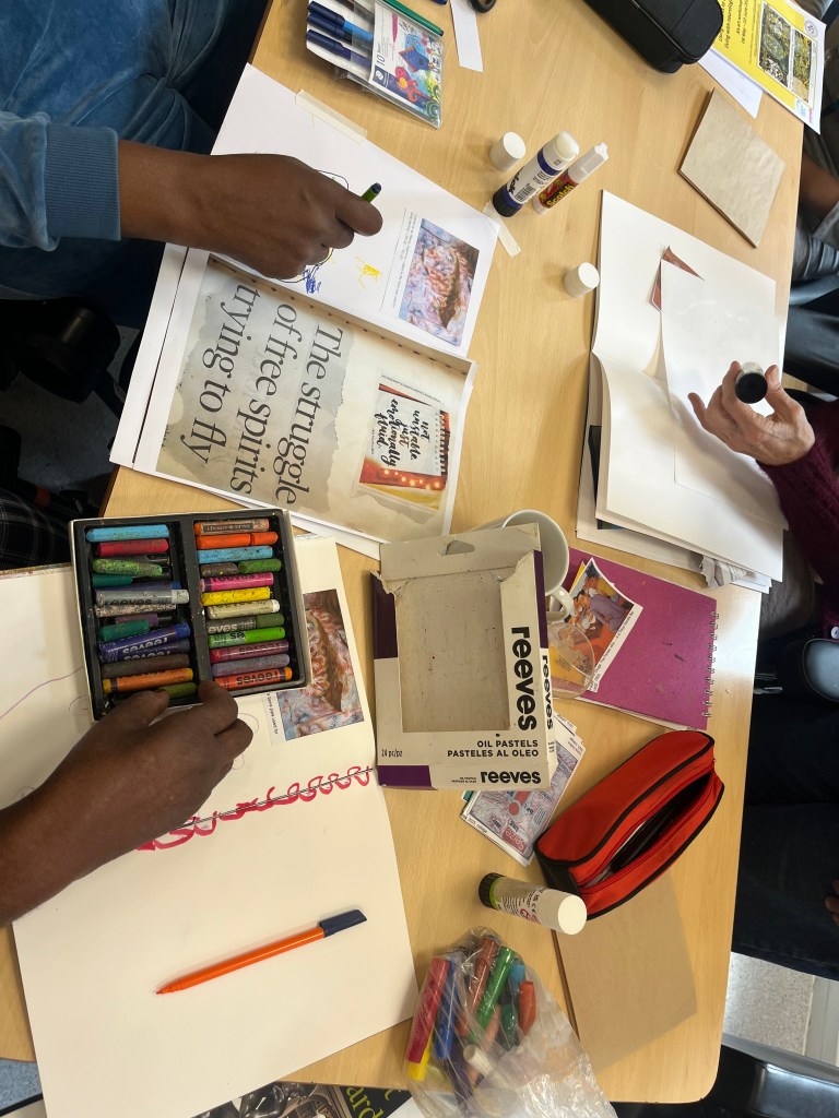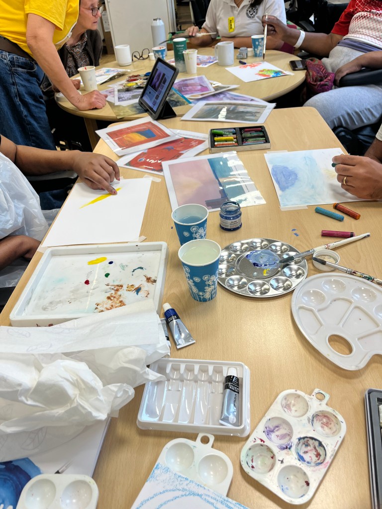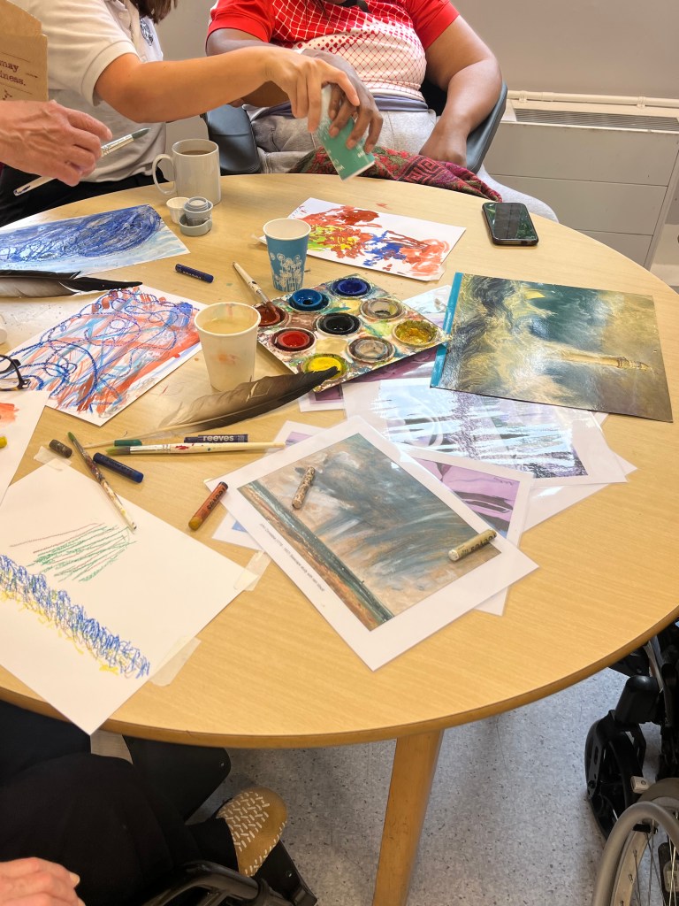We ran six sessions of ‘A Creative Transformation’ (from May 6 – June 10, 2025) for inpatients at the Neurorehabilitation Unit, which is part of the National Hospital for Neurology and Neurosurgery (UCLH NHS Trust). 6 patients joined these sessions, which were facilitated by Lorna Collins (ACT project lead, lived experience), Frances Newman (Visiting artist, NRU) and shadowed by Shuzhai Qin (UCL researcher). The sessions were joined and supported by members of the NRU multidisciplinary team – it was very much a team approach, built flexibly around patients individual, changing needs.